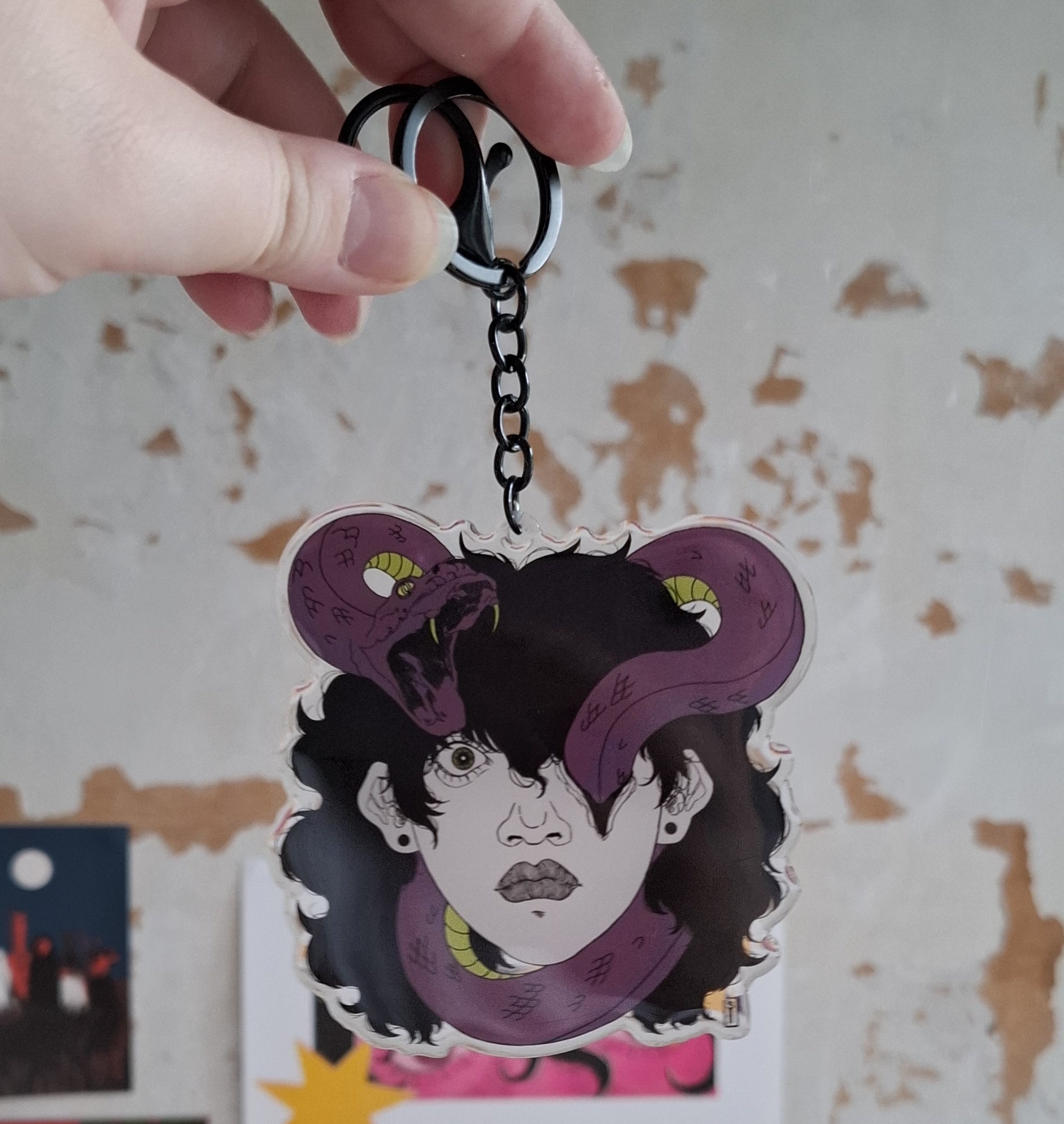 These are acrylic keychains with the Illustration "Snake" printed onto acrylic with doublesided epoxy. The keychain has a Black Metall Lobster Hook Clasp for easy adding to your keyring or any other place you wanna accesorize!